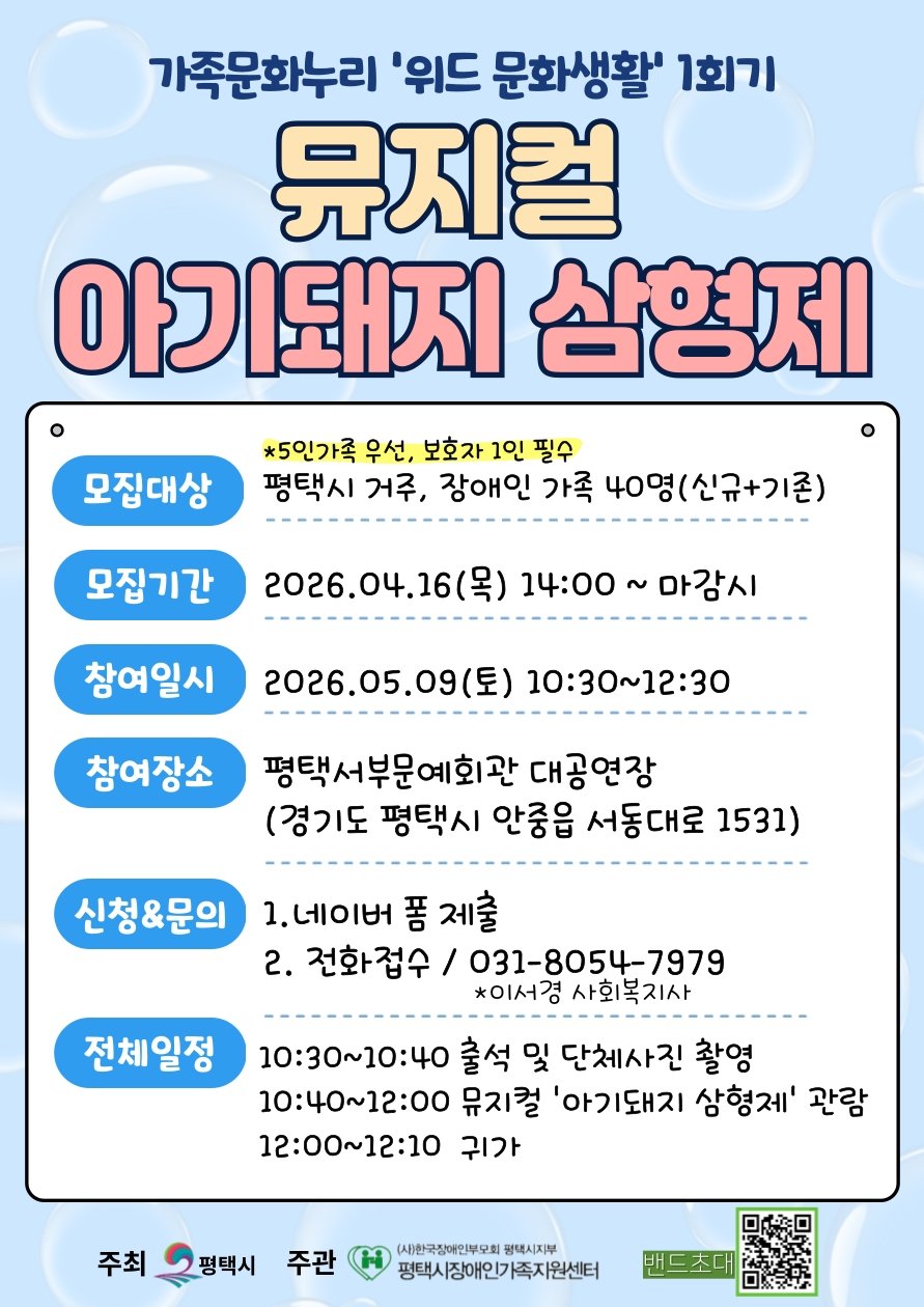 이번 1회기는 오는 5월 9일 오전 10시 30분부터 12시까지 평택서부문예회관에서 진행되며 가족뮤지컬 ‘아기돼지 삼형제’관람 프로그램으로 운영된다.
