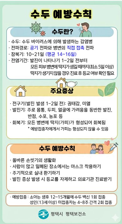 의심 증상자 조기 확인 및 즉시 귀가 조치 발진 발생 후 최소 5일간 등원·등교 중지 손 씻기, 기침예절 실천 및 주기적인 실내 환기 공용물품 소독 및 시설 환경 청결 유지 평택보건소 관계자는 “수두는 어린이집, 유치원, 학교 등 집단시설에서 쉽게 전파될 수 있어 가정과 시설의 적극적인 협조가 중요하다”며 “지속적인 감염병 발생 동향 모니터링과 예방 홍보를 통해 시민 건강 보호에 최선을 다하겠다”고 밝혔다.