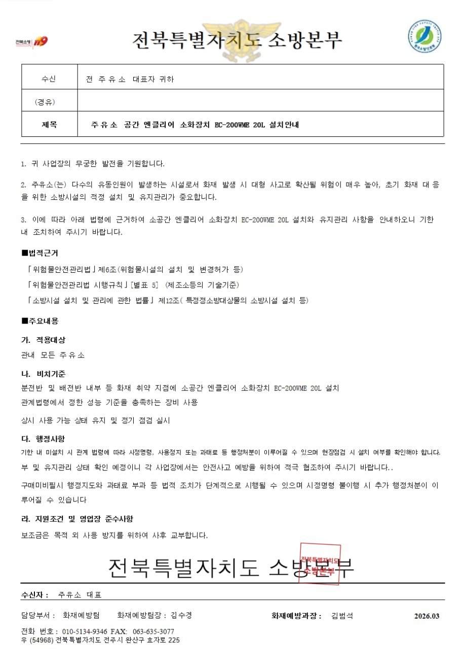피해 예방 요령 △ 소방관서 사칭 전화 시 소속·성명 확인 후 해당 소방서에 사실 여부 확인 △ 소화기 구매 강요·보조금 언급 시 즉시 거절 △ 의심스러운 공문 수신 시 관할 소방서 대응예방과에 문의 이오숙 전북특별자치도소방본부장은 “소방기관의 신뢰를 악용해 경제적 피해를 주는 행위는 결코 용납될 수 없다”며 “피해가 발생하거나 의심 상황이 생기면 즉시 112 또는 관할 소방서로 신고해 달라”고 당부했다.