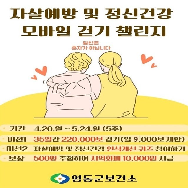 [충청뉴스큐] 충북 영동군보건소는 군민의 정신건강 증진과 자살예방 인식 확산을 위해 ‘자살예방 및 정신건강 인식개선 모바일 걷기 챌린지’를 운영한다고 밝혔다.