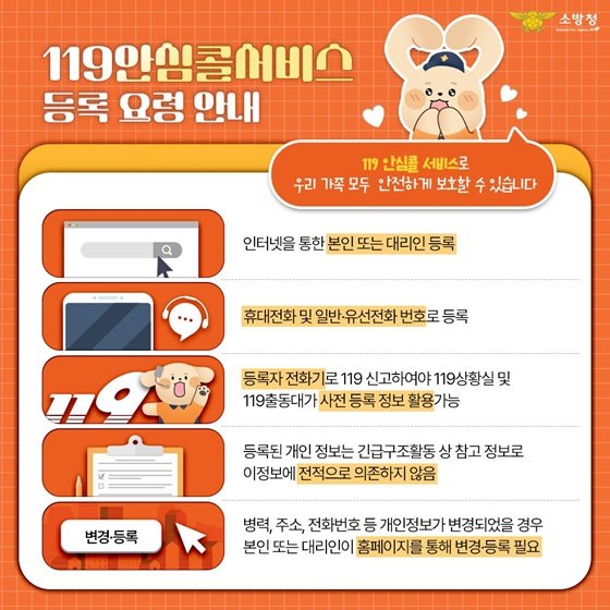 119안심콜서비스는 보호자 연락처, 기저질환, 복용 약물 등 개인의 건강 정보를 사전에 등록하면 119 신고 시 상황실과 구급대원이 해당 정보를 즉시 확인해 보다 적절한 응급처치와 병원 이송을 지원하는 제도다.
