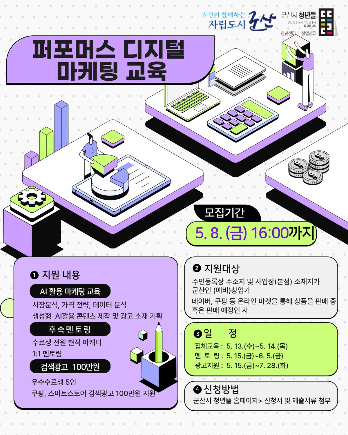 [충청뉴스큐] 군산시 청년뜰 창업센터가 4월 20일부터 5월 8일까지 지역 온라인 창업가의 디지털 마케팅 역량 강화를 위한 ‘2026년 퍼포먼스 디지털 마케팅 교육’ 참여자를 모집한다.