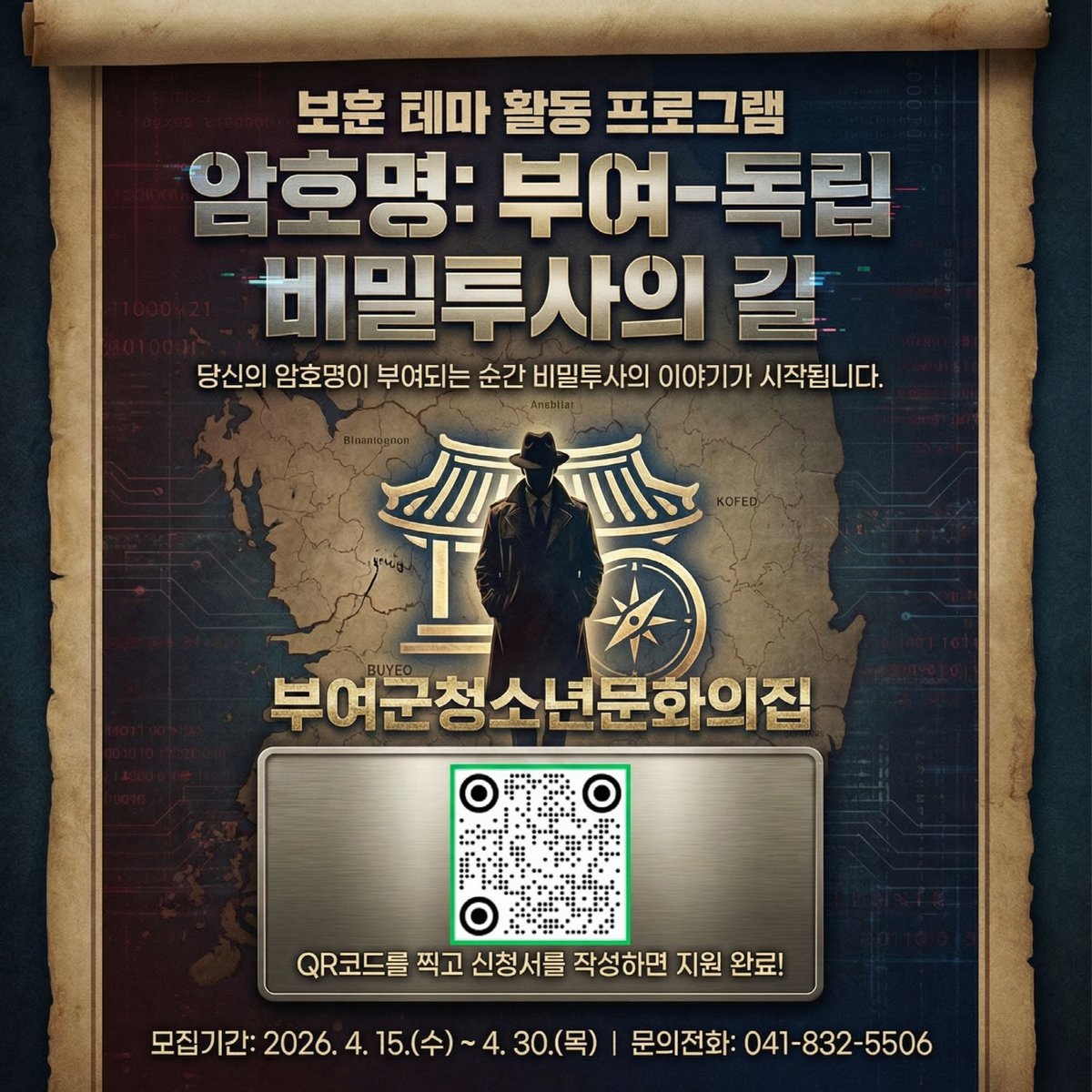 [충청뉴스큐] 부여군시설관리공단 청소년문화의집은 국가보훈부 공모사업에 선정된 2026년 보훈 테마 활동 프로그램 암호명 부여-독립 비밀투사의 길 에 참여할 청소년을 4월 30일까지 모집한다.