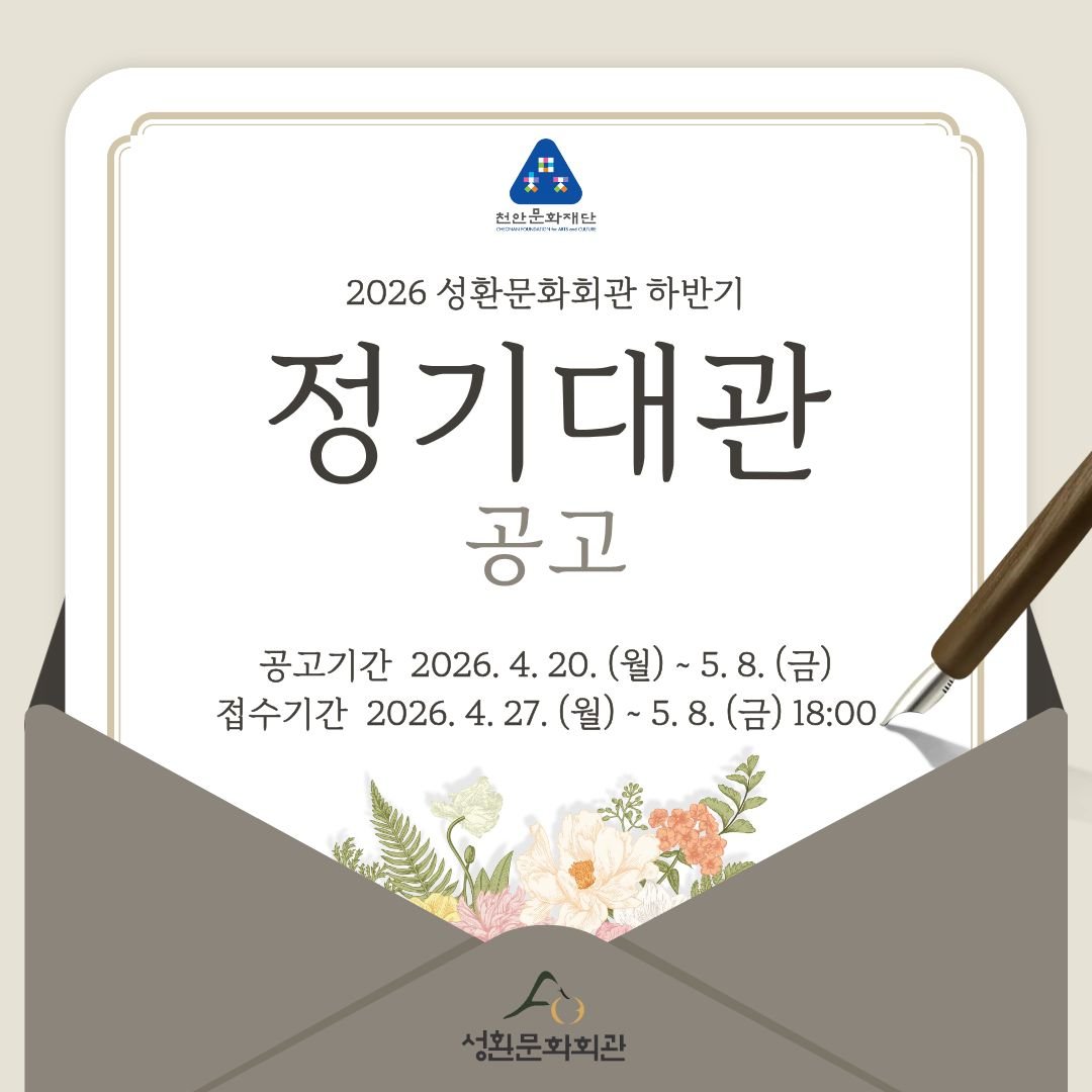 신청은 성환문화회관 누리집에서 가능하며 선정 결과는 다음달 15일 확인할 수 있다.