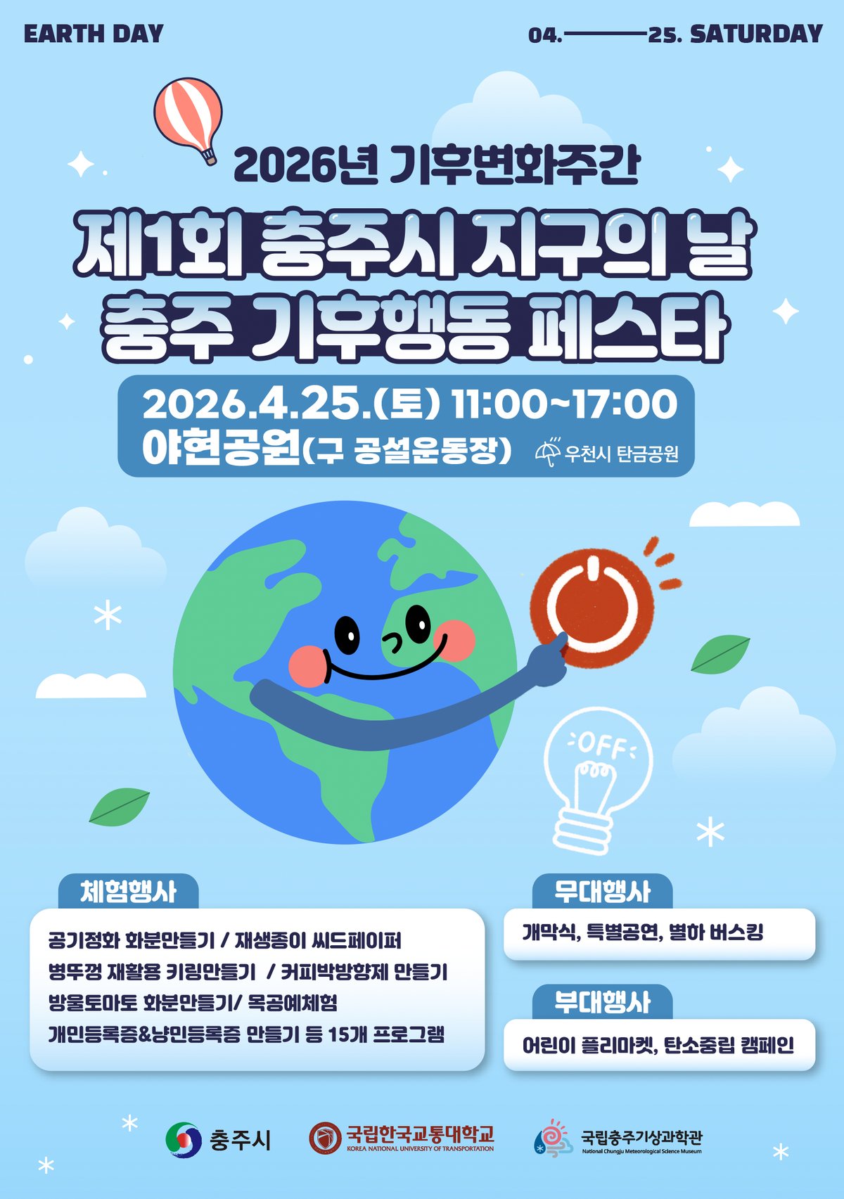 [충청뉴스큐] 충주시는 25일 오전 11시 야현공원 일원에서 ‘2026년 기후변화주간’을 기념해 ‘제1회 충주시 지구의 날’행사를 개최한다고 21일 밝혔다.