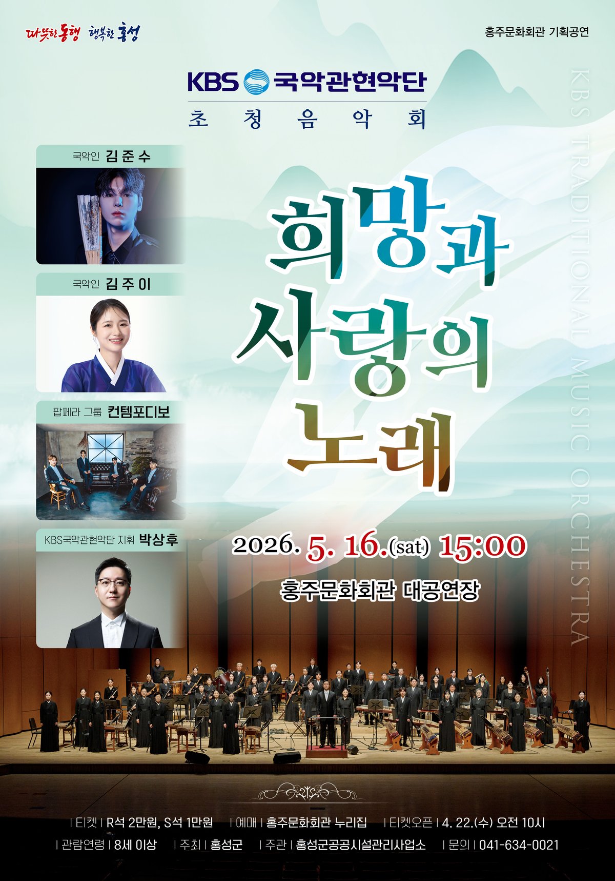 [충청뉴스큐] 홍성군 홍주문화회관은 오는 5월 16일 오후 3시, 가정의 달 특별 기획으로 ‘KBS국악관현악단 초청음악회 - 희망과 사랑의 노래’를 무대에 올린다.