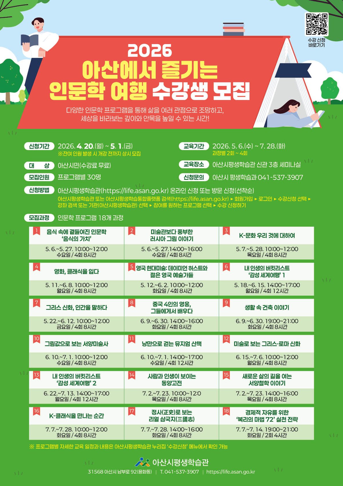 2026 아산에서 즐기는 인문학 여행 은 ‘낭만으로 걷는 뮤지엄 산책’을 비롯해 클래식과 영화의 만남, 현대미술 및 세계 여행 테마, 건축, 동서양 철학 등 폭넓은 주제를 아우르는 총 18개 프로그램으로 기획됐다.