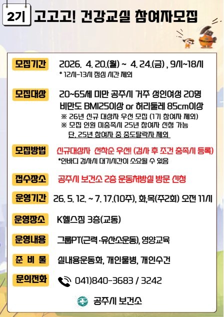 참여 신청은 4월 24일까지 공주시 보건소 2층 운동처방실을 방문해 선착순으로 접수하면 된다.