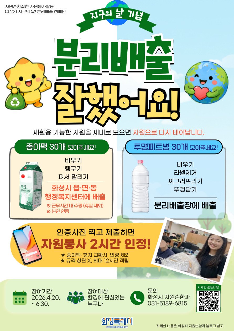 [충청뉴스큐] 화성특례시가 2026년 ‘지구의 날’을 맞아 시민들이 일상 속에서 환경 보호를 실천할 수 있는 자원봉사 활동 분리배출 잘했어요 캠페인을 운영한다고 밝혔다.
