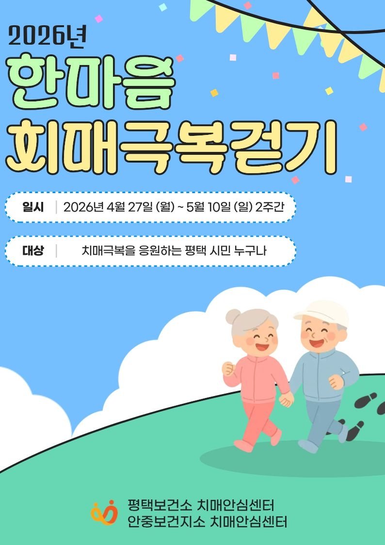[충청뉴스큐] 평택보건소 치매안심센터와 안중보건지소 치매안심센터에서는 지역 주민의 치매 예방과 인식개선을 위해 ‘2026년 한마음 치매극복 걷기 행사’를 오는 4월 27일부터 5월 10일까지 2주간 진행한다.
