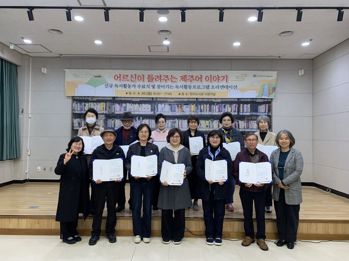 [충청뉴스큐] 제주 어르신들이 직접 제주어 동화구연가로 나선다. 한라도서관은 20일 도서관 강의실에서 올해 ‘어르신이 들려주는 제주어 이야기’ 신규 활동가 양성과정 수료식을 열었다.