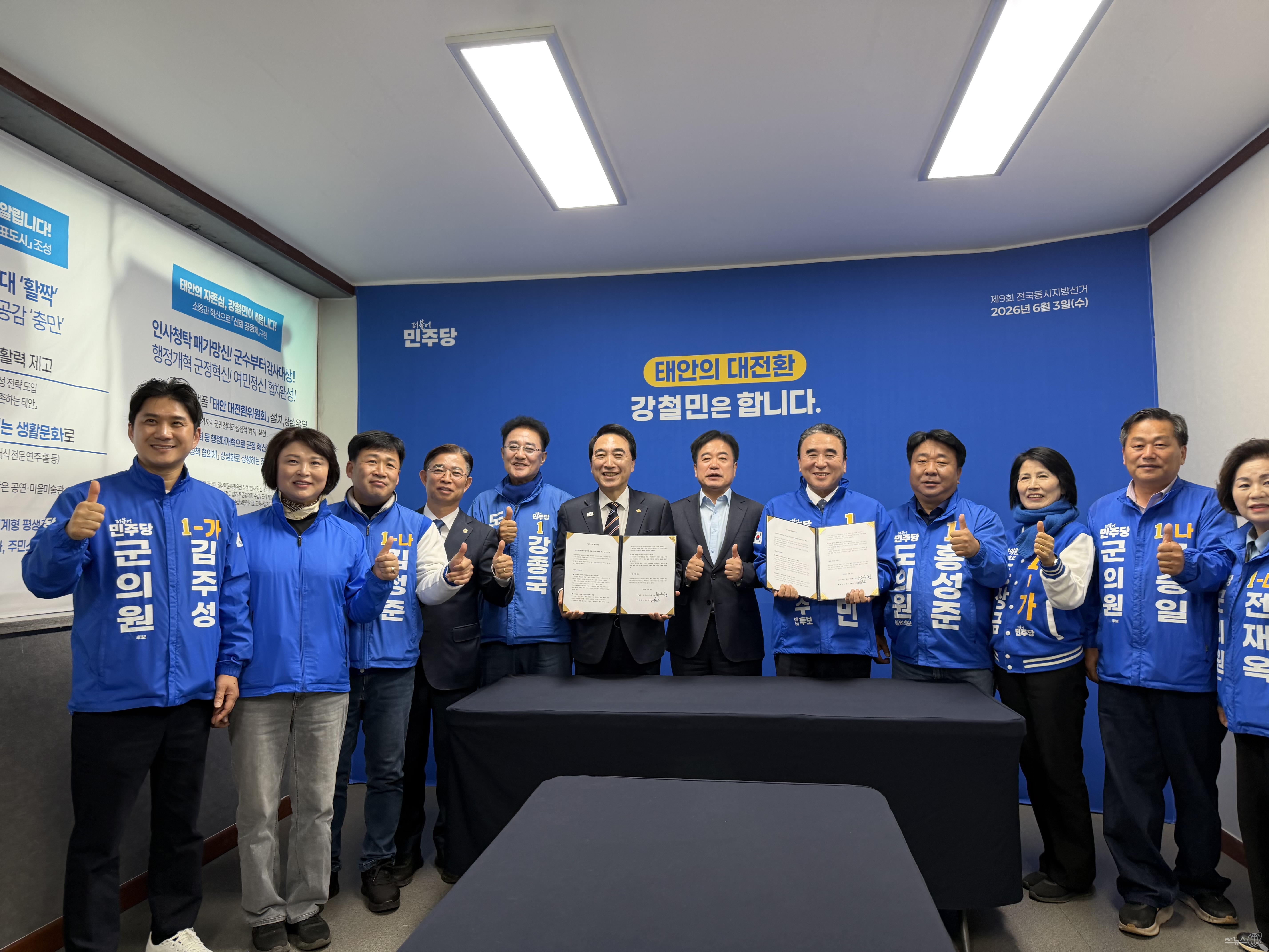 두 후보는 21일 강철민 후보 선거사무소에서 ‘태안–충남 정책연대’ 협약식을 열고, 지역소멸 위기 극복과 지속가능한 성장 기반 구축을 위한 실질적 협력 방안을 제시했다.