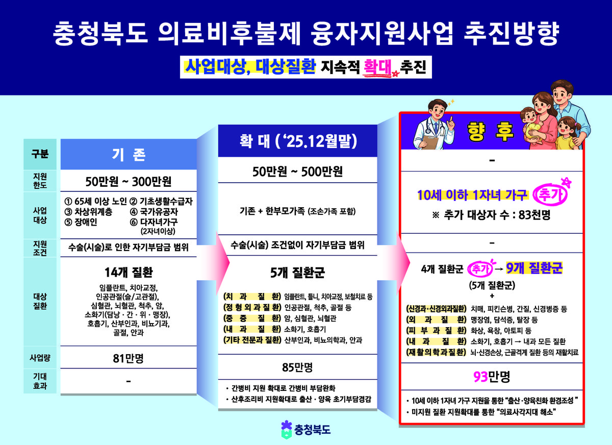 충청북도는 여기에서 더 나아가 지원 대상을 10세 이하 자녀를 둔한 자녀 가정까지 확대하고 신경과·외과·피부과·재활의학과 등 4개 질환군을 추가해 기존 5개 질환군에서 총 9개 질환군으로 확대할 계획이다.