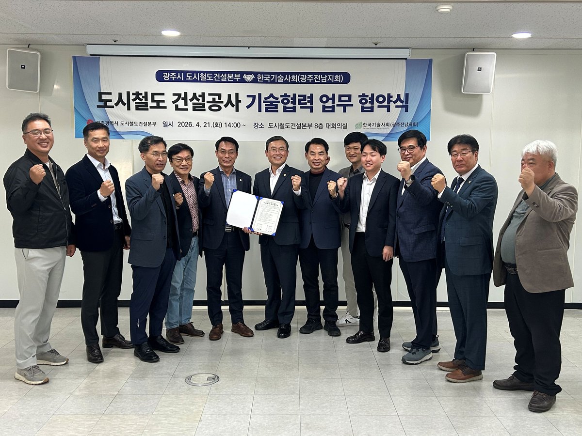 [충청뉴스큐] 광주광역시 도시철도건설본부는 21일 본부 8층 대회의실에서 한국기술사회 광주·전남지회와 ‘광주시 도시철도 2호선 건설공사 기술협력 업무협약’을 체결했다.