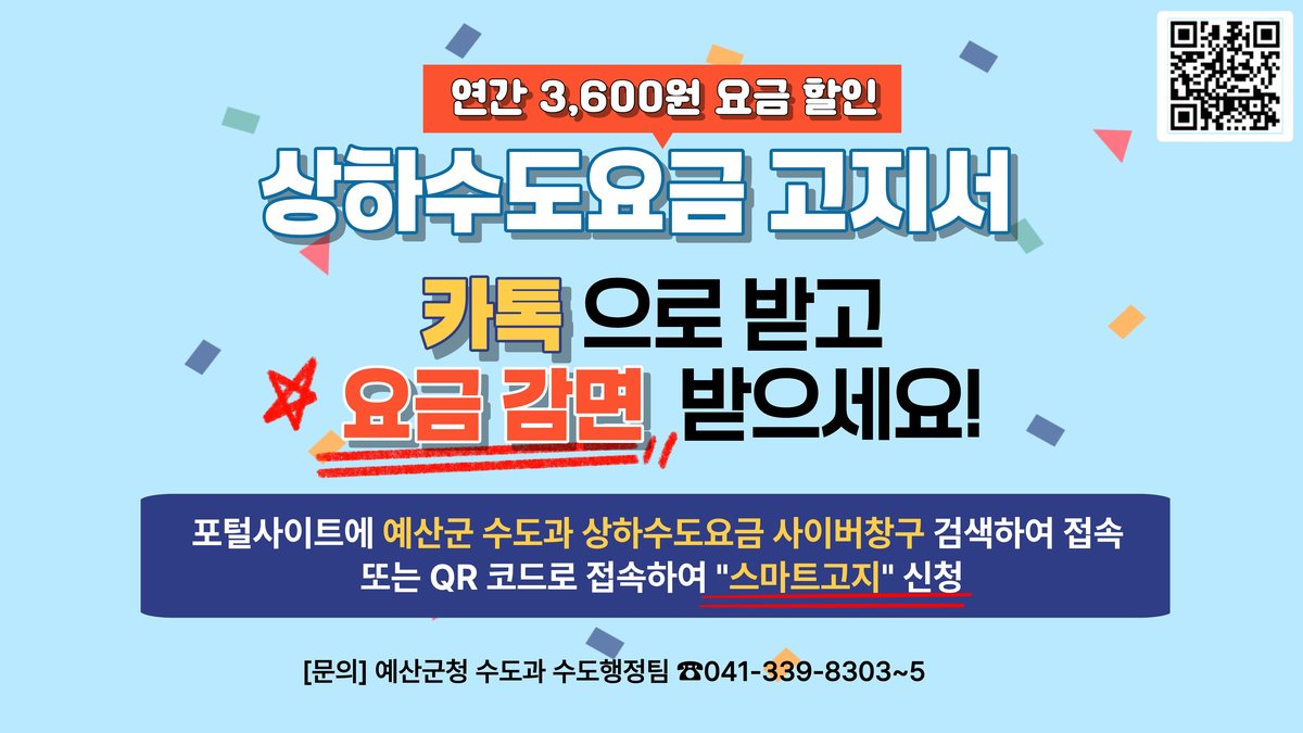 [충청뉴스큐] 예산군은 수도요금을 카카오톡 알림톡으로 간편하게 확인하고 납부할 수 있는 ‘스마트고지 서비스’ 이용을 늘리기 위해 홍보를 강화한다고 밝혔다.