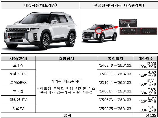 토레스 등 6개 차종 51,535대는 메모리 과부하로 인해 계기판 디스플레이가 멈추거나 꺼질 가능성으로 4월 20일부터 시정조치를 진행하고 있고 토레스 EVX 등 2개 차종 18,533대는 소프트웨어 설계 미흡으로 후방추돌경고등 점멸 주기를 만족하지 않는 안전기준 부적합으로 4월 20일부터 시정조치를 진행하고 있다.