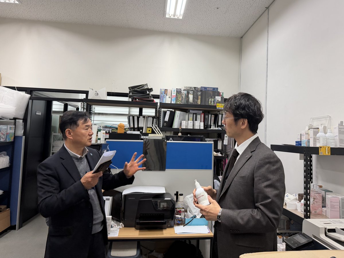 이원구 수원시 경제정책국장을 비롯한 현장 지원단은 두피 보호기능 화장품을 생산하는 크로마흐를 찾아 이동환 대표를 비롯한 임직원들과 이야기를 나눴다.