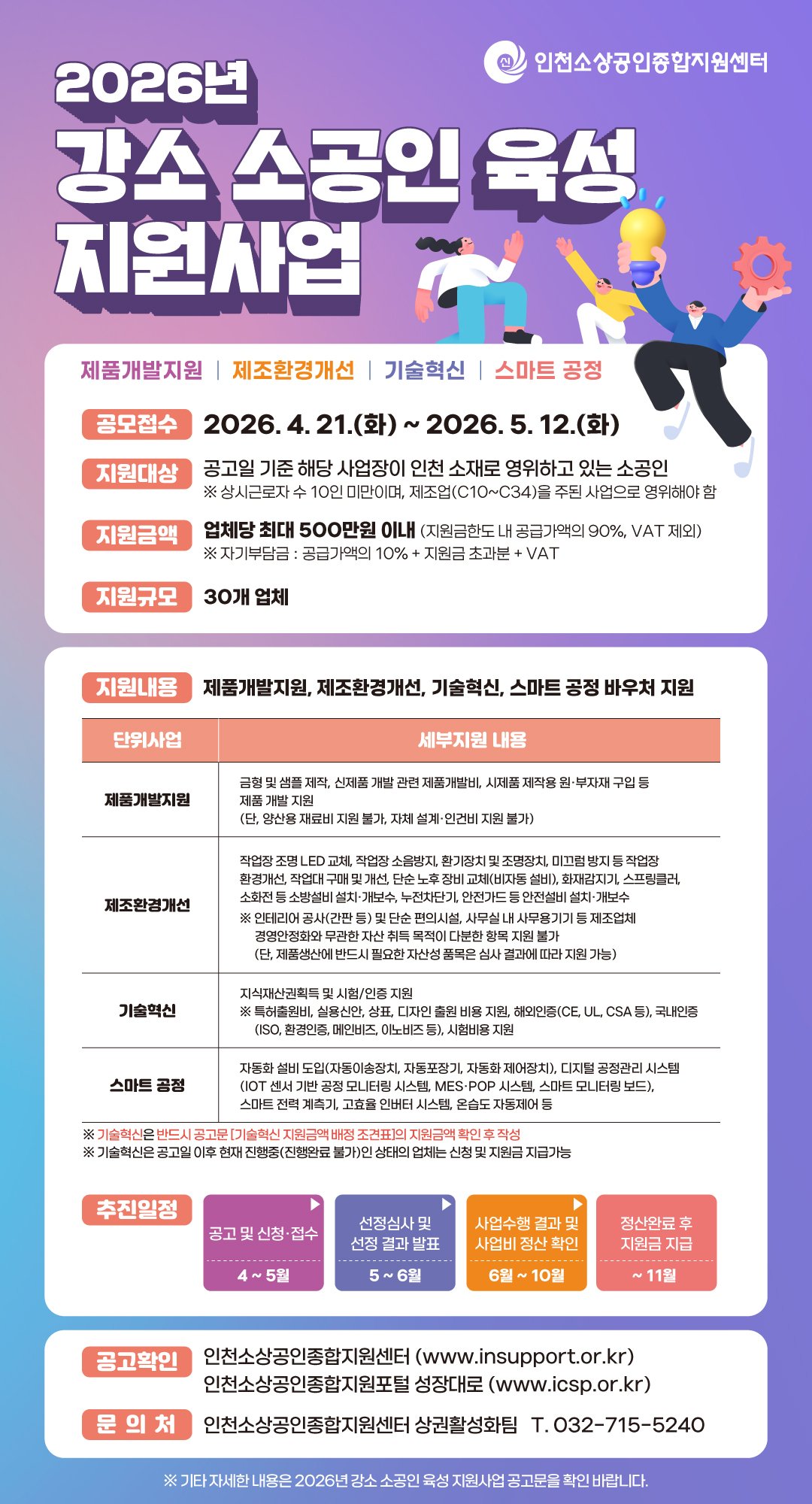 신청 대상은 공고일 기준 인천시에 사업장을 두고 제조업을 주된 업종으로 영위하는 소공인이며 접수는 4월 21일부터 5월 12일까지 인천소상공인종합지원센터 방문 또는 우편을 통해 가능하다.