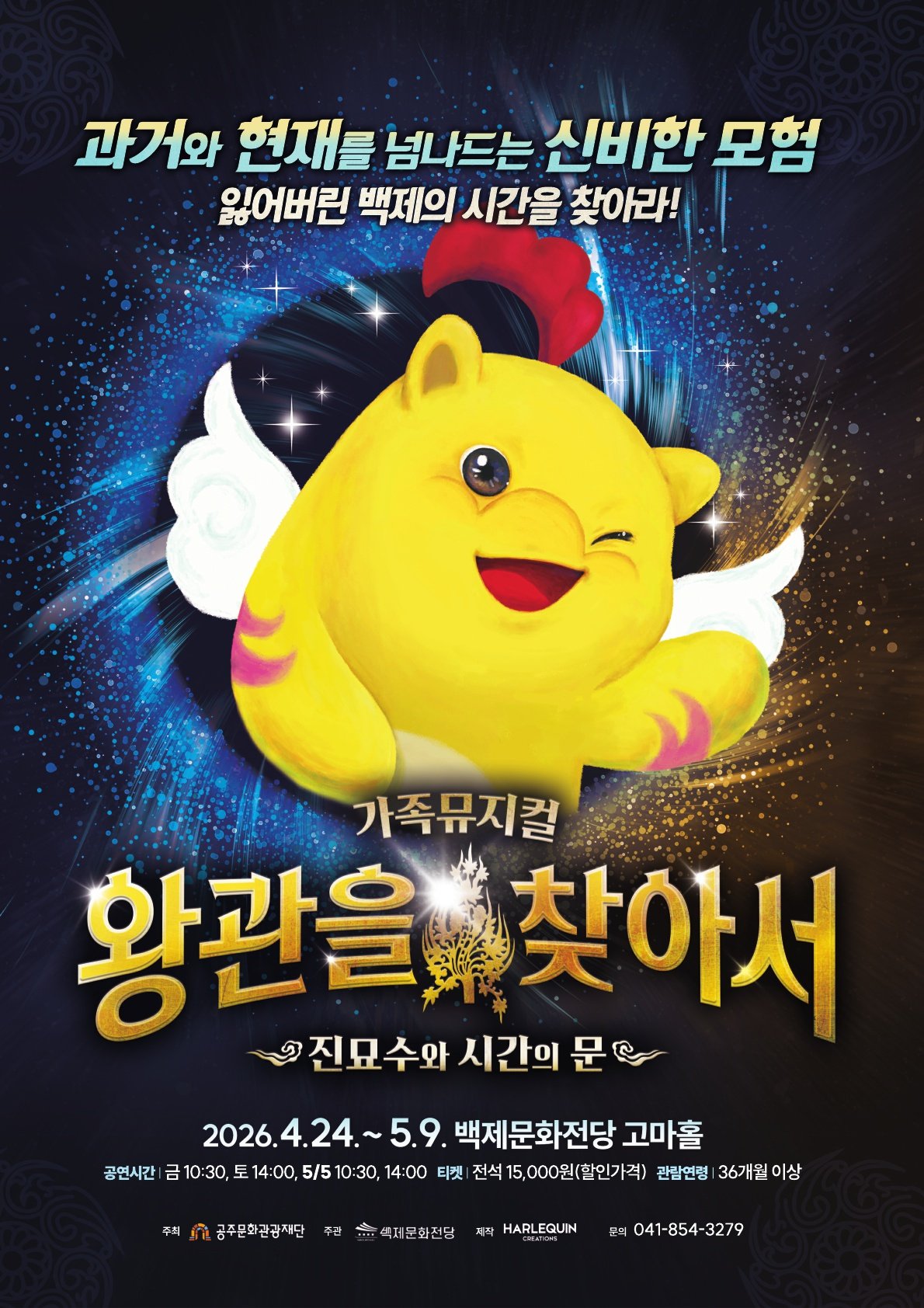 [충청뉴스큐] 백제문화전당이 오는 4월 24일부터 5월 9일까지 어린이 뮤지컬 전문 제작사 할리퀸크리에이션즈와 손잡고 참여형 에듀테인먼트 가족극 ‘왕관을 찾아서: 진묘수와 시간의 문’을 선보인다.