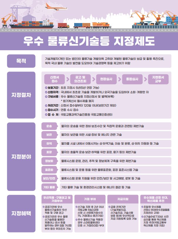 물류신기술 제도는 국내 최초로 개발되거나 외국에서 도입해 개량한 물류기술을 평가해 △신규성 △진보성 △경제성 △현장적용성 △보급·활용성이 우수한 기술을 국토교통부 장관이 지정하는 제도다. 물류기술의 보급 및 활용 촉진을 위해’ 20년부터 시행됐으며 지금까지 총 9건이 지정됐다.