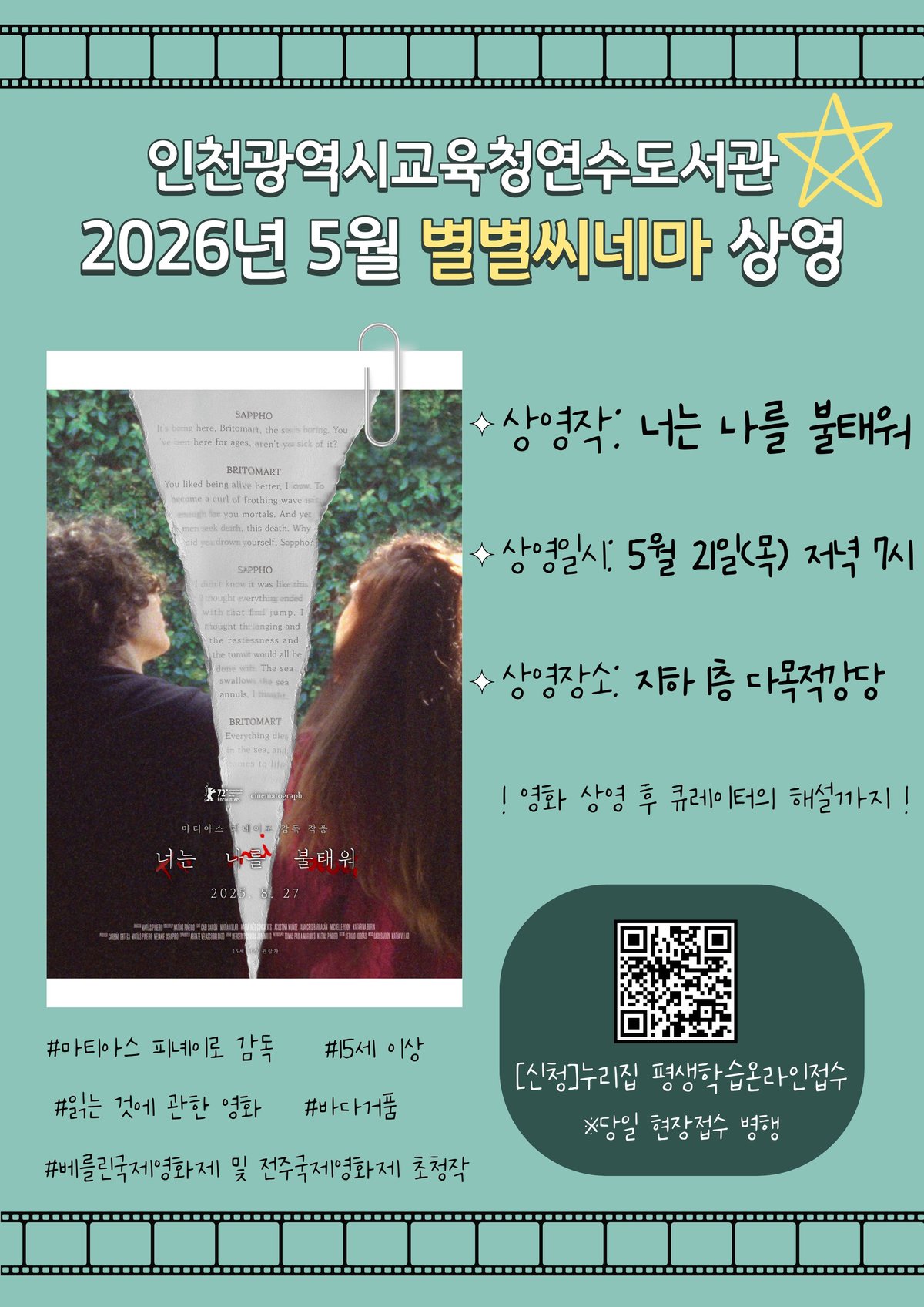 [충청뉴스큐] 인천광역시교육청연수도서관은 5월의 다양성영화 별별씨네마 로 마티아스 피녜이로 감독의 ‘너는 나를 불태워’를 상영한다.