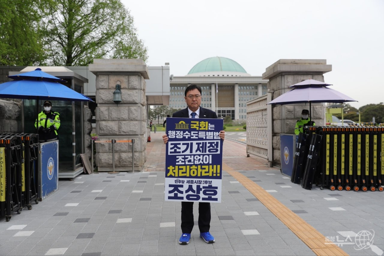 조상호 후보는 22일 오전 국회 정문 앞에서 ‘행정수도특별법 통과’를 촉구하는 1인 피켓시위를 진행한 뒤, 국회 본청으로 자리를 옮겨 국토위 법안심사소위원회 소속 의원들에게 법안의 필요성을 설명했다. 이어 맹성규 국토교통위원장을 만나 조속한 처리를 요청했다.