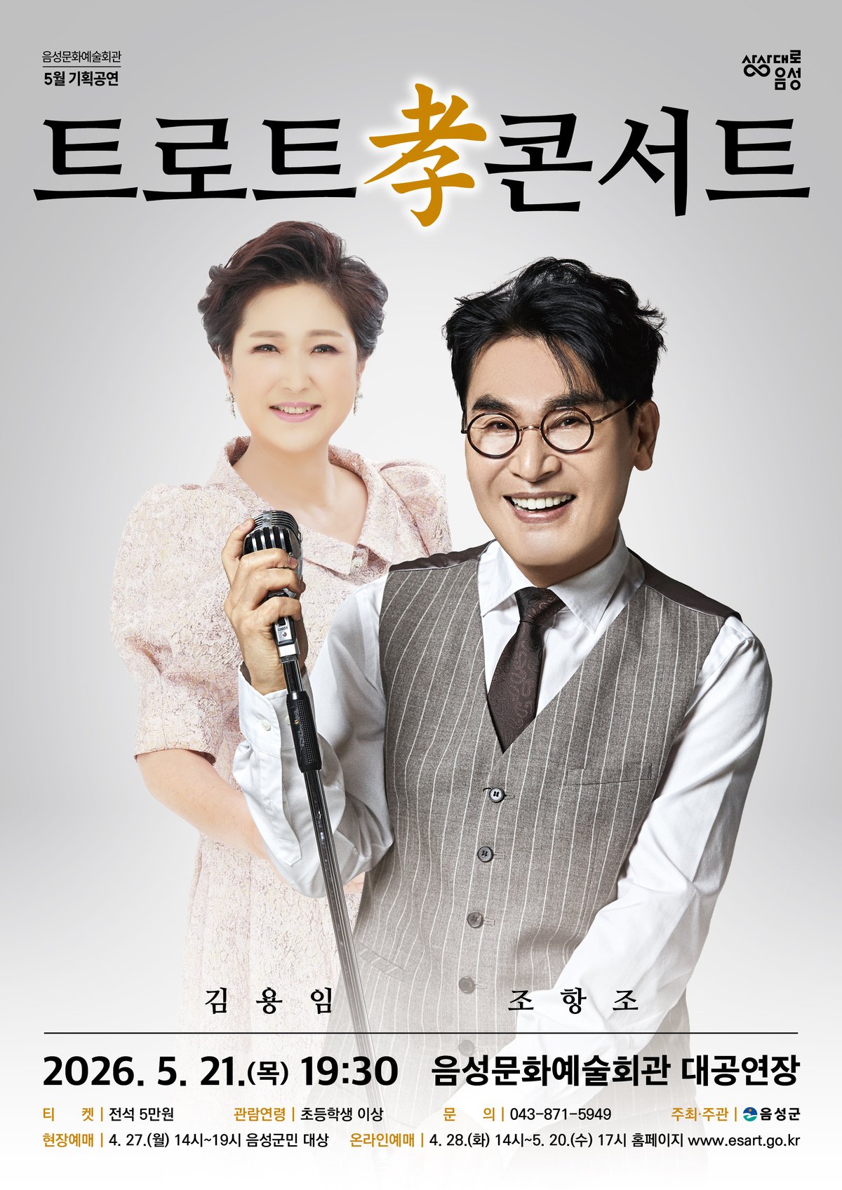 [충청뉴스큐] 음성군은 사랑과 감사의 달 5월을 맞아 따뜻한 위로와 즐거움을 선사할 트로트 콘서트를 오는 5월 21일 오후 7시 30분 음성문화예술회관에서 개최한다.