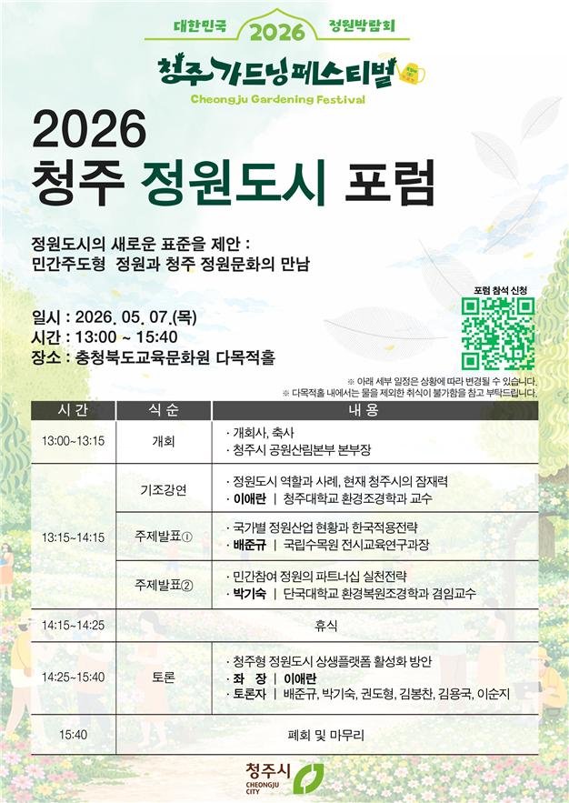 [충청뉴스큐] 청주시는 오는 5월 7일 충청북도교육문화원 다목적홀에서 ‘2026 청주 정원도시 포럼’을 개최한다고 밝혔다.