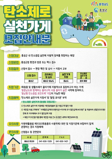 신청은 홍성군청 환경과 청소행정팀 방문 또는 팩스로 연중 수시 신청 가능하며 지정 기준은 △1회용품 및 생활쓰레기 줄이기에 자발적으로 동참 △‘충청남도와 함께하는 플라스틱 사용 줄이기 실천’서약 참여 △‘충남형 탄소중립 포인트제’ 가입이 가능한 곳이어야 한다.