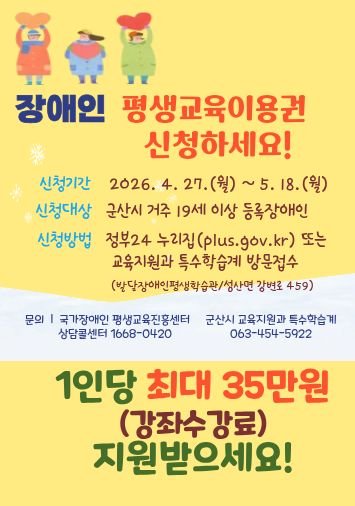 [충청뉴스큐] 군산시는 학습 취약계층의 교육 기회를 넓히고 자아실현을 지원하기 위해 관내 19세 이상 등록 장애인을 대상으로 연 35만원 상당의 평생교육 이용권을 지원한다고 23일 밝혔다.