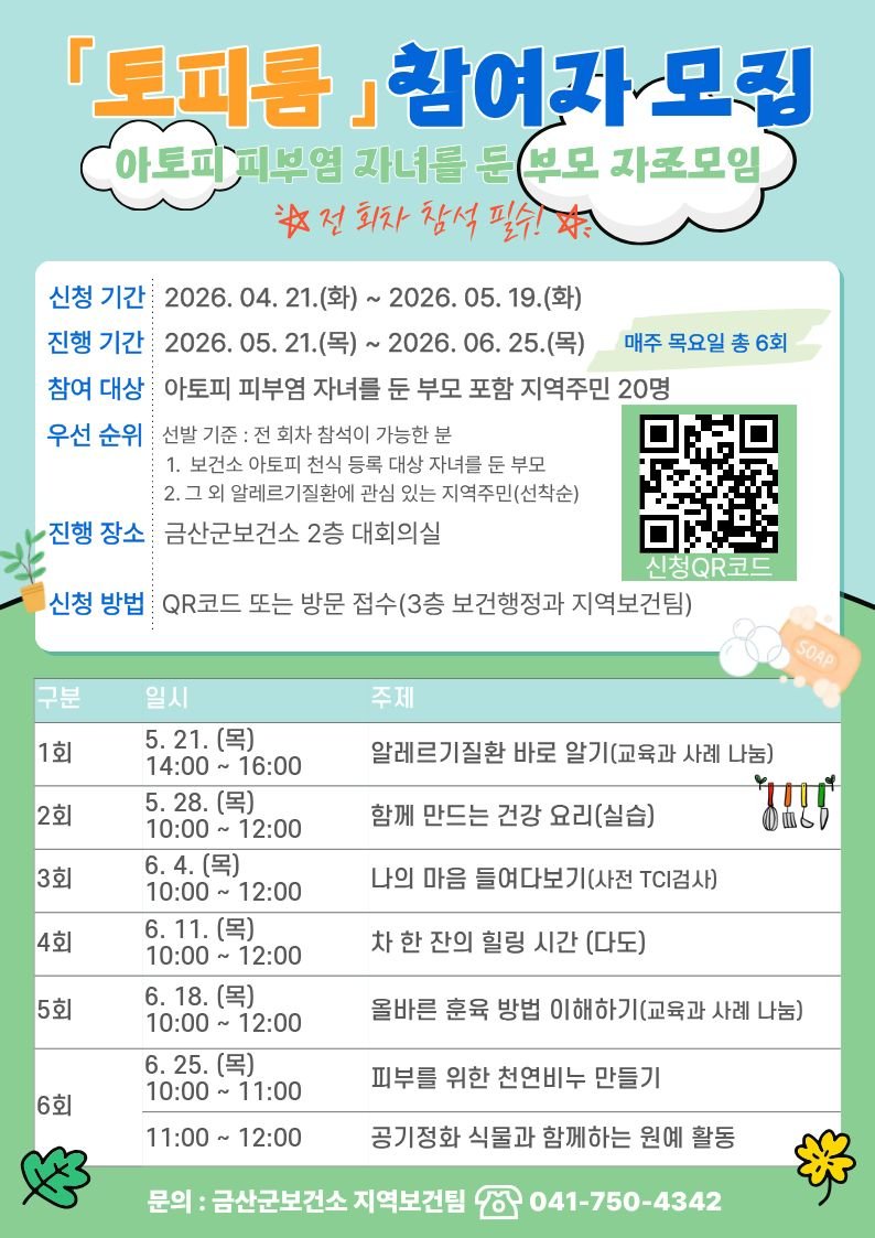 [충청뉴스큐] 금산군보건소는 아토피 피부염 자녀를 둔 부모의 정서적 지지와 올바른 건강관리 역량 강화를 위해 5월 19일까지 부모 자조모임 ‘토피룸’ 참여자를 모집한다.