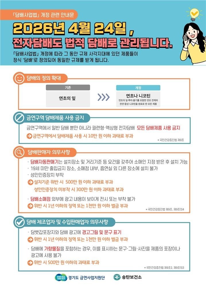 또한 담배사업법 개정으로 인해 규제 사각지대에 있던 제품들이 정식 담배로 정의되어 동일한 규제를 받게 되는 시행 초기인 만큼, 혼선을 줄이기 위해 4월 24일부터 5월 15일까지를 집중 계도 기간으로 운영하며 현장 안내와 단속을 병행할 예정이다.