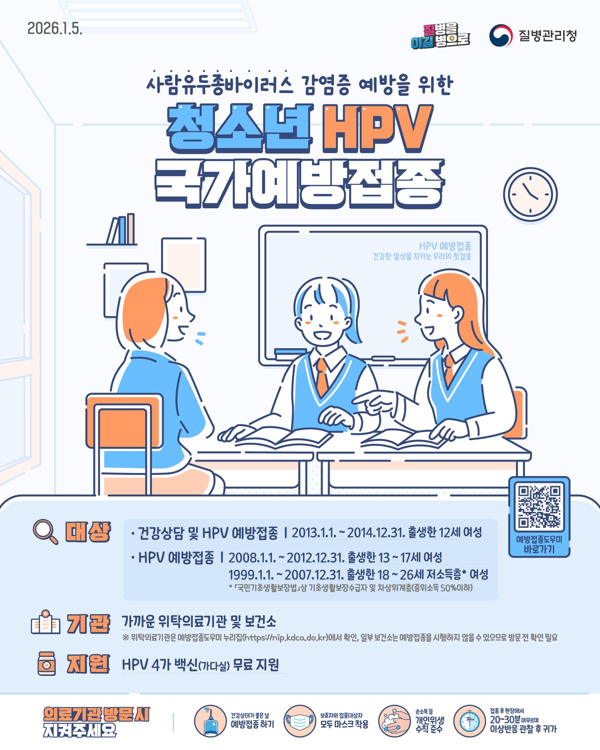 접종 대상자는 가까운 위탁의료기관 또는 보건소를 방문해 무료로HPV백신을 접종받을 수 있으며 접종 가능 의료기관과 접종대상 해당 여부는 예방접종도우미 누리집을 통해 확인할 수 있다.