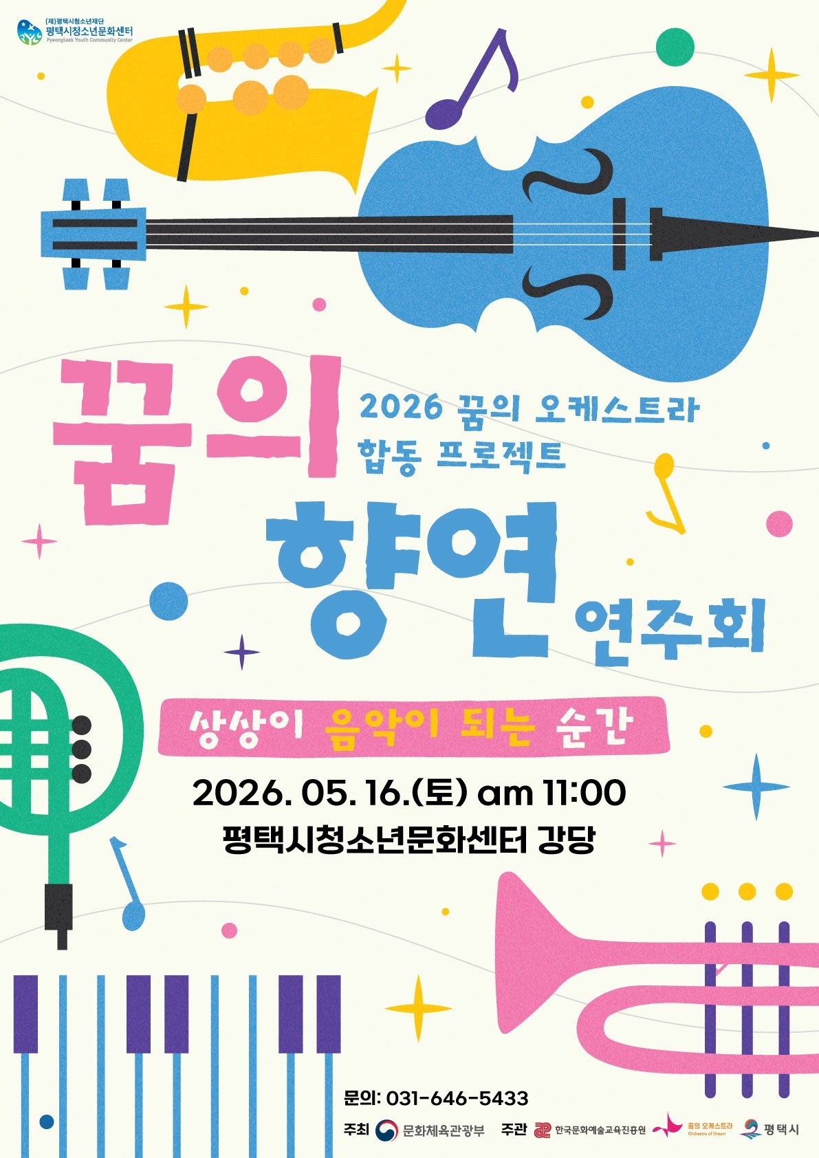 ‘2026 꿈의 향연’은 문화체육관광부와 한국문화예술교육진흥원이 주최하고 평택시청소년문화센터가 주관하는 사업으로 전국 55개 지역 꿈의 오케스트라 단원들이 음악을 통해 지역사회에 ‘위로’ 와 ‘희망’의 메시지를 전달하는 전국 단위 합동 프로젝트이다.