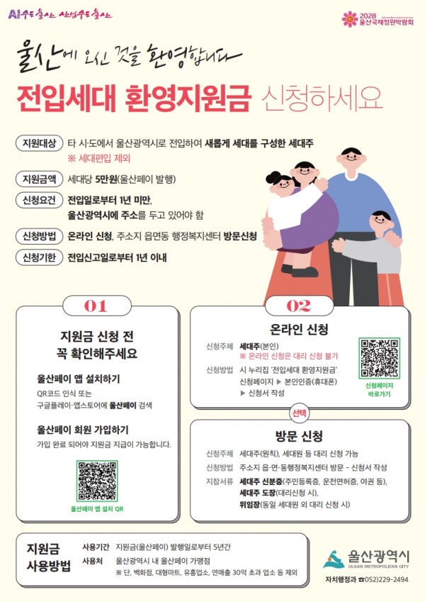 전입세대 환영 지원금은 울산에 새롭게 세대를 구성한 전입세대를 환영하고 울산에 조기 정착을 지원하기 위해 세대당 5만원을 울산페이로 지원하는 사업이다.