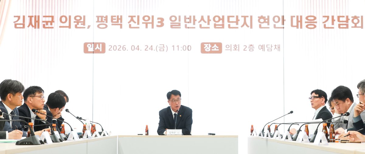 김재균 의원은 24일 경기도의회 2층 예담채에서 경기도 산업입지과, 평택시 반도체AI과, 평택도시공사, 사업시행자, 그리고 입주기업 대표가 참석하는 ‘진위3일반산업단지 현안 대응 간담회’를 긴급 개최했다.