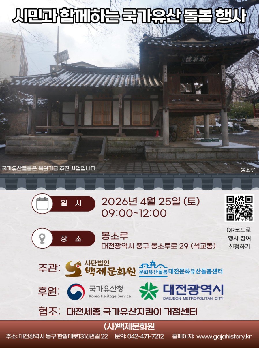 [충청뉴스큐] 대전시는 대전문화유산 돌봄센터와 함께 4월 25일 오전 9시부터 12시까지 봉소루 일원에서 ‘시민과 함께하는 국가유산 돌봄행사’를 개최했다.