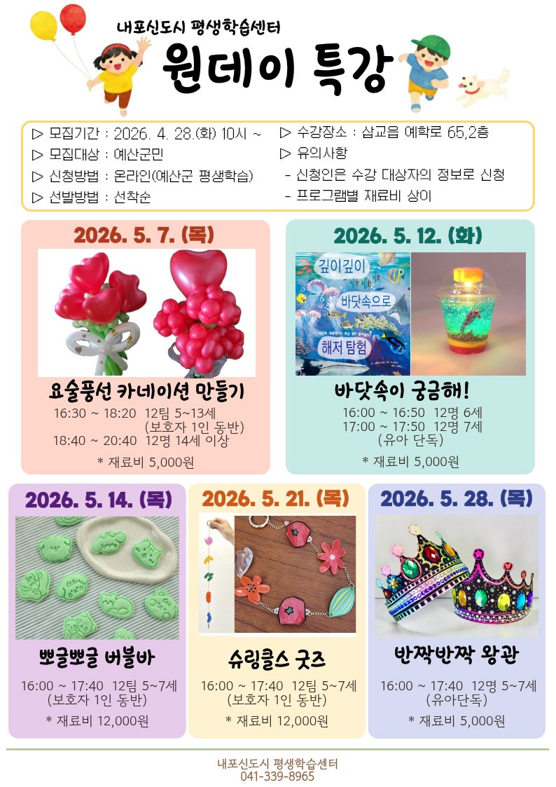 [충청뉴스큐] 예산군 내포신도시 평생학습센터는 5월을 맞아 지역 어린이를 위한 체험형 원데이 특강 프로그램을 운영한다.