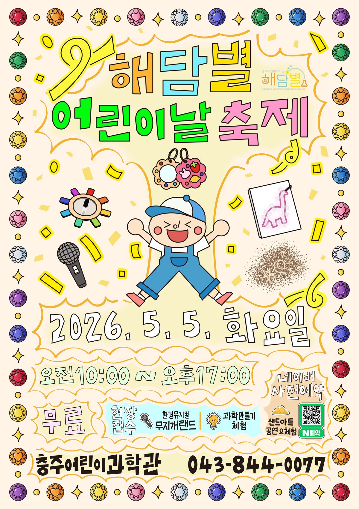 [충청뉴스큐] 충주어린이과학관은 오는 5월 5일 어린이날을 맞아 연나이 8세 이하 어린이와 동반 가족을 대상으로 ‘해담별 어린이날 축제’를 무료로 개최한다고 밝혔다.