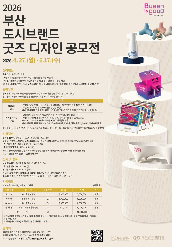 [충청뉴스큐] 부산시와 (재)부산디자인진흥원은 오늘부터 6월 17일까지 2026 부산 도시브랜드 굿즈 디자인 공모전을 개최한다고 밝혔다.