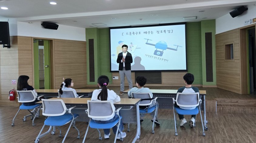 이번 프로그램은 드론의 구조와 작동 원리, 드론축구 경기 방식에 대한 이론 교육과 함께 드론 관련 직업군 소개 및 진로탐색 활동을 병행하고 기초 조종 실습과 미니게임을 통해 자연스럽게 기술을 익힐 수 있도록 구성했다.