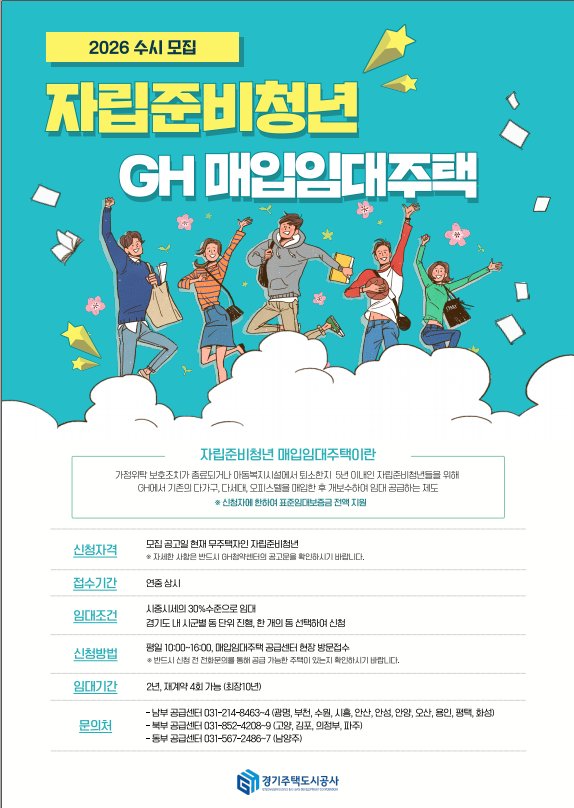 자립준비청년 대상 27명 연중 상시 모집 보호종료 아동의 자립을 돕기 위해 자립준비청년을 위한 매입임대주택예비입주자 27명을 연중 상시 모집한다.