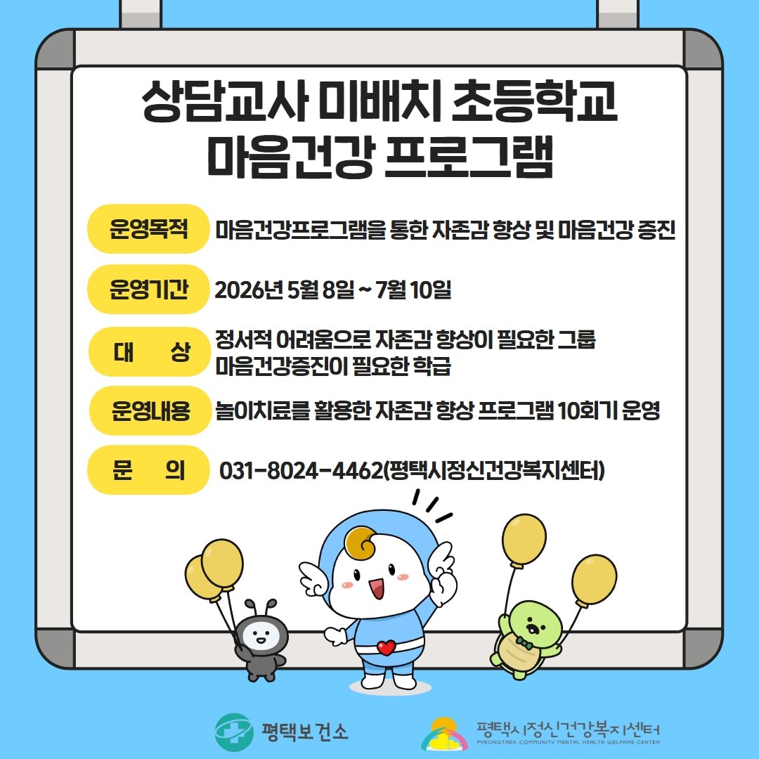 [충청뉴스큐] 평택시는 상담교사가 배치되지 않은 초등학교 학생들의 정신건강 지원을 위해 ‘마음건강 프로그램’을 운영한다고 밝혔다.