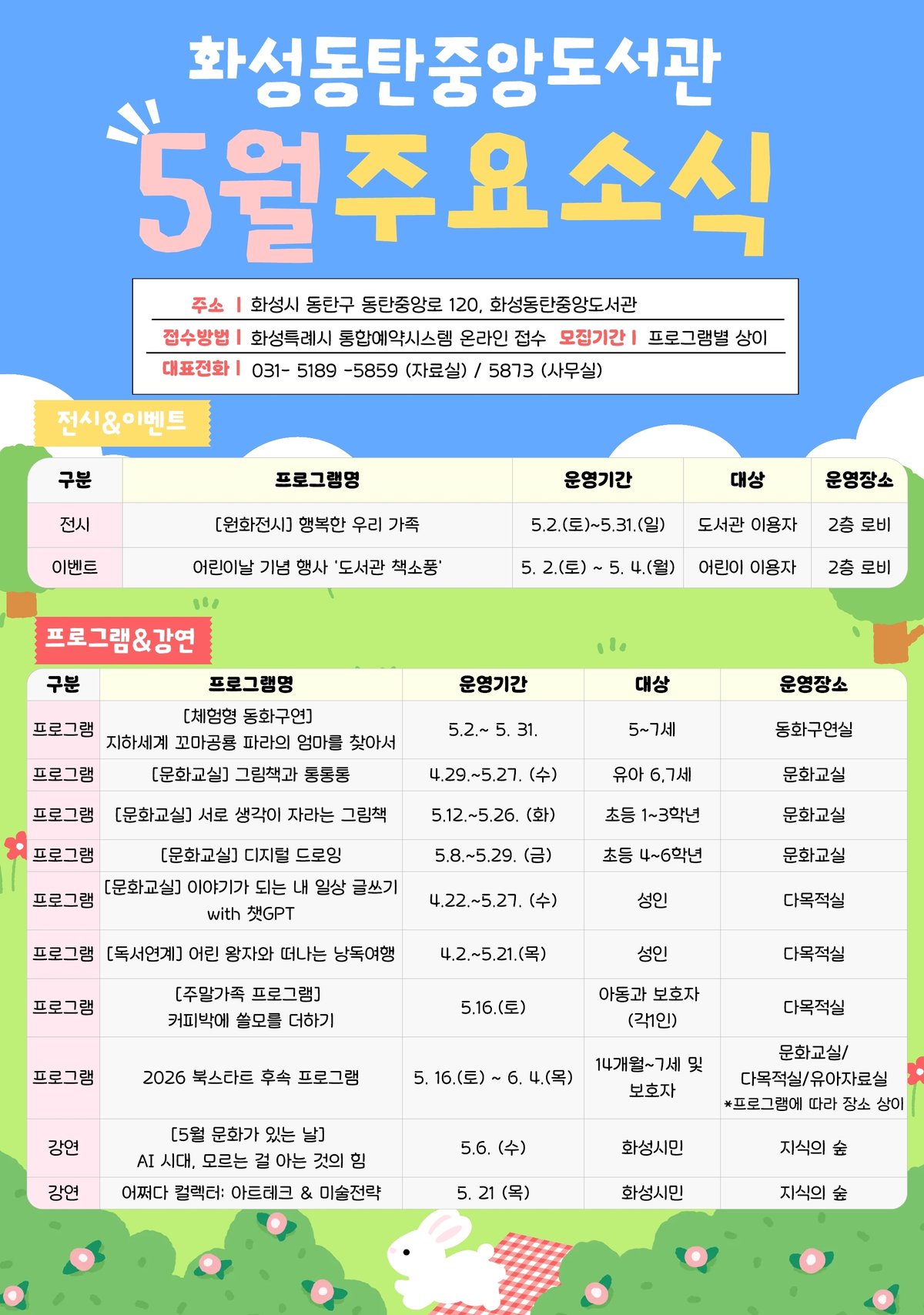 5월 2일부터 4일까지는 어린이날 기념 행사 ‘화성동탄중앙도서관 책소풍’을 운영하고 5월 한 달 동안은 가족 친화형 체험·전시·독서문화 프로그램을 중심으로 다채로운 행사를 이어갈 예정이다.