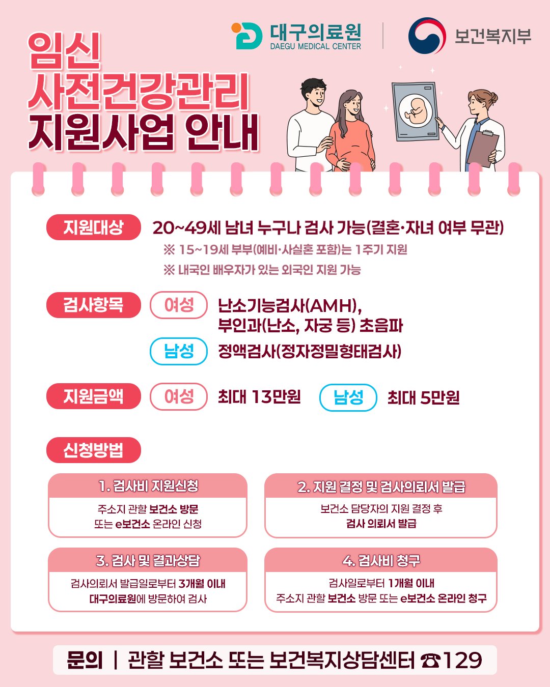 임신 사전건강관리 지원사업은 임신을 준비 중인 남녀에게 필수 가임력 검사를 지원해 난임 및 고위험 요인을 조기에 발견하고 관리할 수 있도록 돕기 위해 추진되고 있다.
