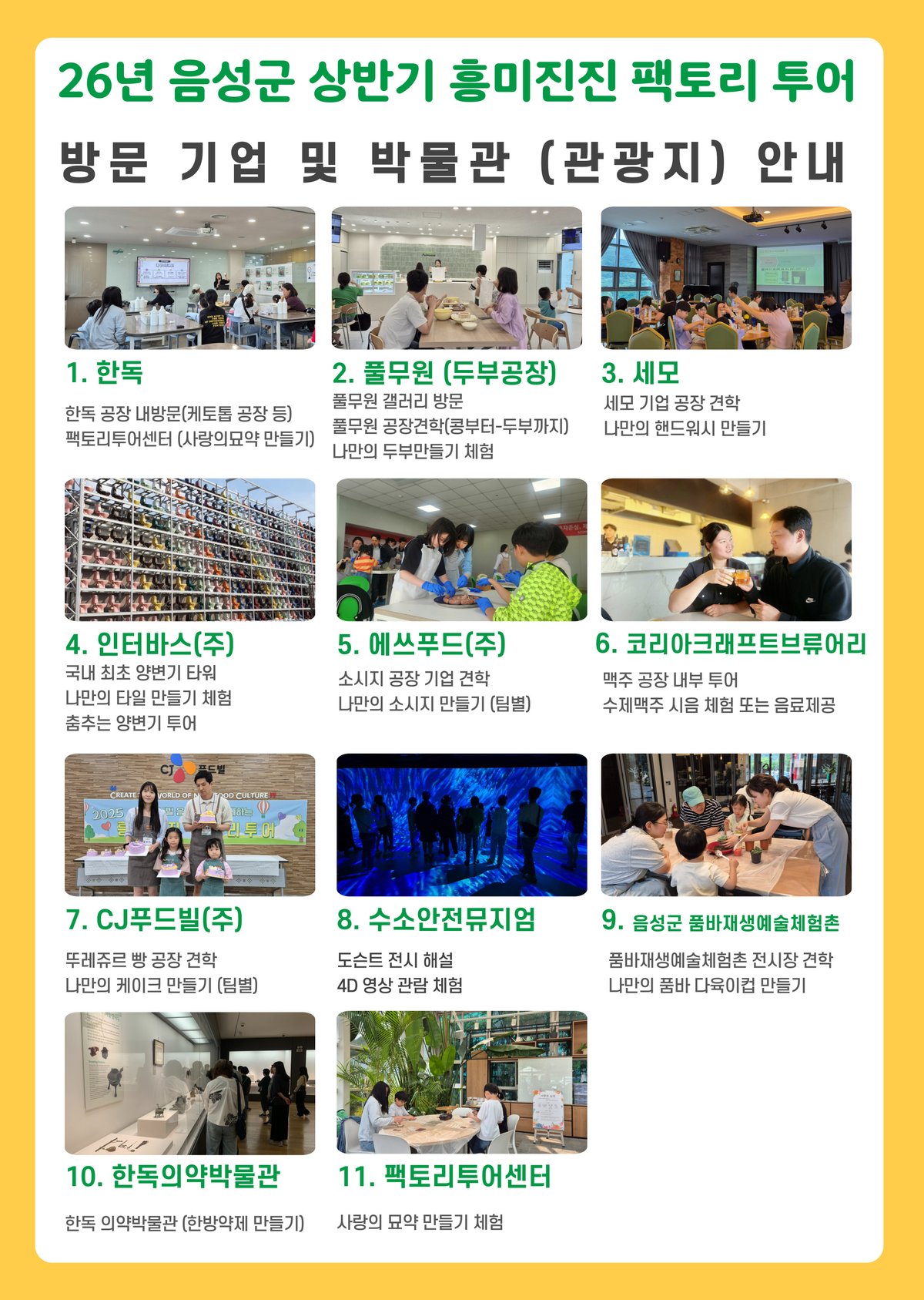 기업 체험뿐 아니라, 수소안전뮤지엄, 품바재생예술체험촌, 한독의약박물관, 팩토리투어센터 등 음성군 주요 관광지 또한 방문해 더욱 풍성한 여행이 될 것으로 기대된다.