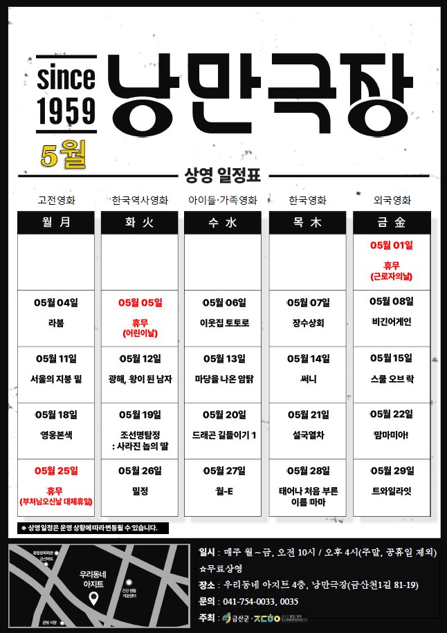[충청뉴스큐] 금산군은 도시재생사업으로 조성된 우리동네아지트 4층 낭만극장에서 진행하는 5월 무료영화 상영을 안내했다.