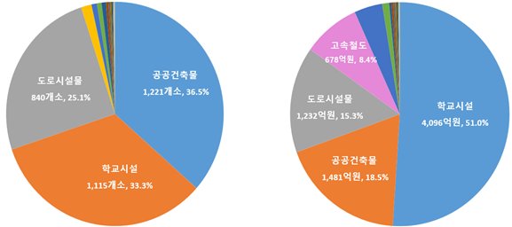 지난해에는 8,037억원의 예산을 들여 3,344개소 공공시설물의 내진성능을 추가로 확보했다. 시설물별로는 공공건축물과 학교시설이 가장 많았다.