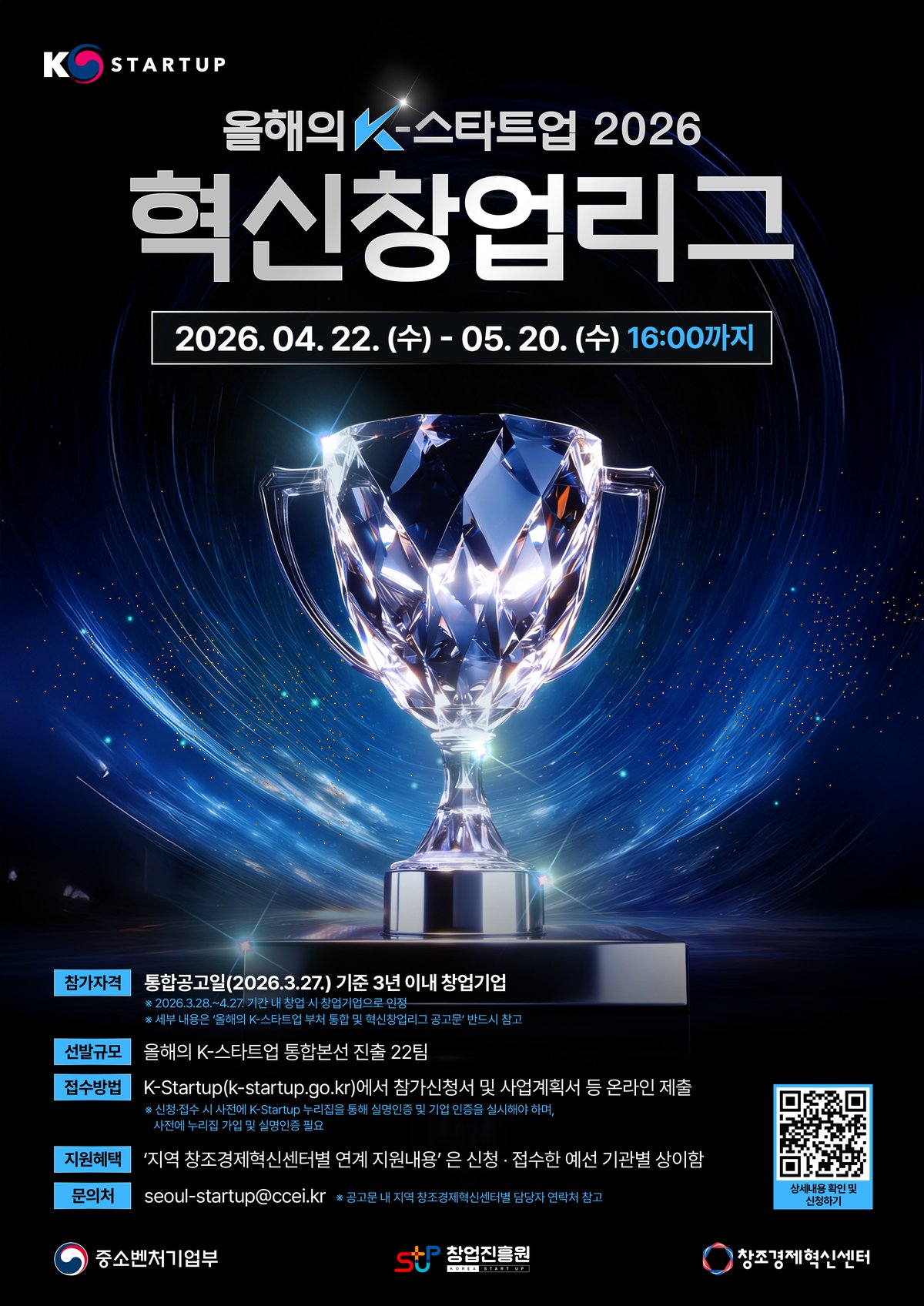 [충청뉴스큐] 충남창조경제혁신센터는 오는 5월 20일 오후 4시까지 우수한 기술력과 사업모델을 보유한 창업기업을 대상으로 ‘올해의 K-스타트업 2026'혁신창업리그 참가자를 모집한다고 밝혔다’올해의 K-스타트업 2026'은 중소벤처기업부를 비롯해 교육부, 국방부, 문화체육관광부 등 12개 부처가 협력해 운영하는 국내 최대 규모의 창업 경진대회로 부처별 예선을 거쳐 통합 본선과 왕중왕전까지 이어지는 단계별 경쟁을 통해 유망 창업기업을 선발하는 프로그램이다.