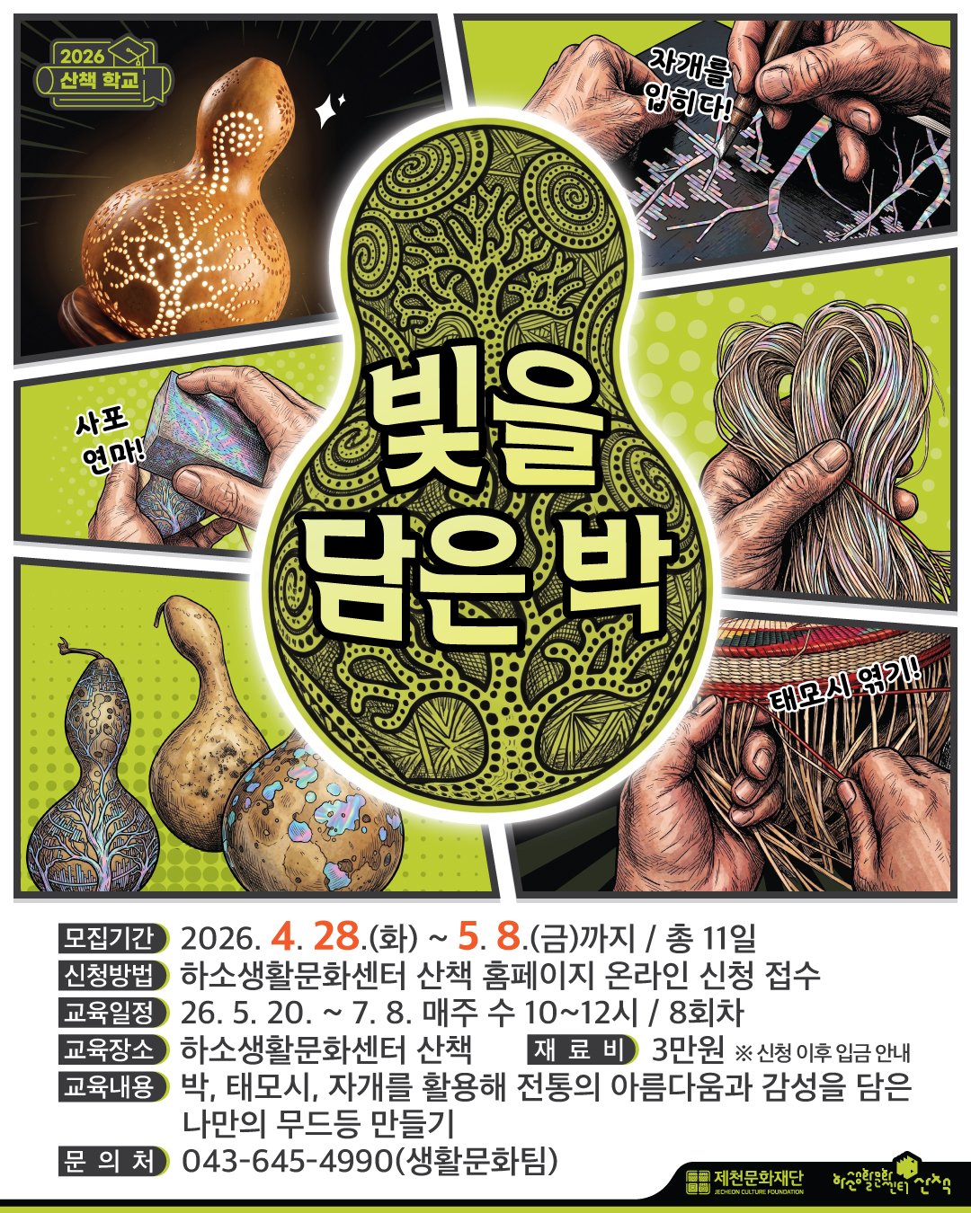 [충청뉴스큐] 제천문화재단이 운영하는 하소생활문화센터 산책에서 시민 참여형 문화예술교육 프로그램 ‘산책학교’의 ‘빛을 담은 박’ 수강생을 모집한다.